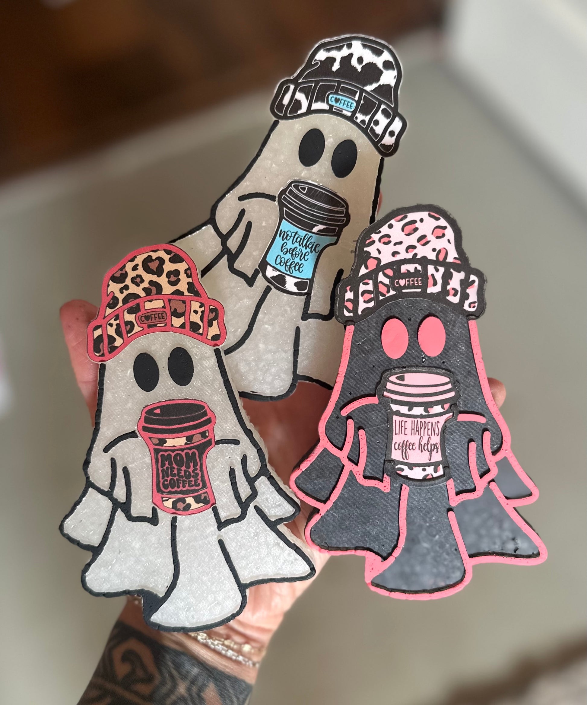 Dimensions: Approximately 3” x 4.5”. Freshie can come with cardstock designed beanie and/or coffee mug or this freshie can be completely hand painted and decorated.