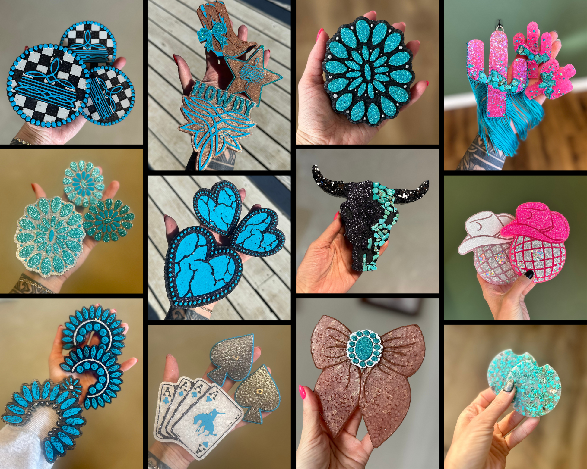 Build your own car accessory gift box by choosing your style of car freshies, and go from there! Vent clips will match the hanging freshie exactly, or match the theme of the freshie design. You have the option to add embellishments, such as turquoise stones. Please specify how you would like your freshie designed with colors, glitter, etc. USE CODE FRESHIEBOX15 at checkout to save 15% when you add accessories to the freshie bundle pack!