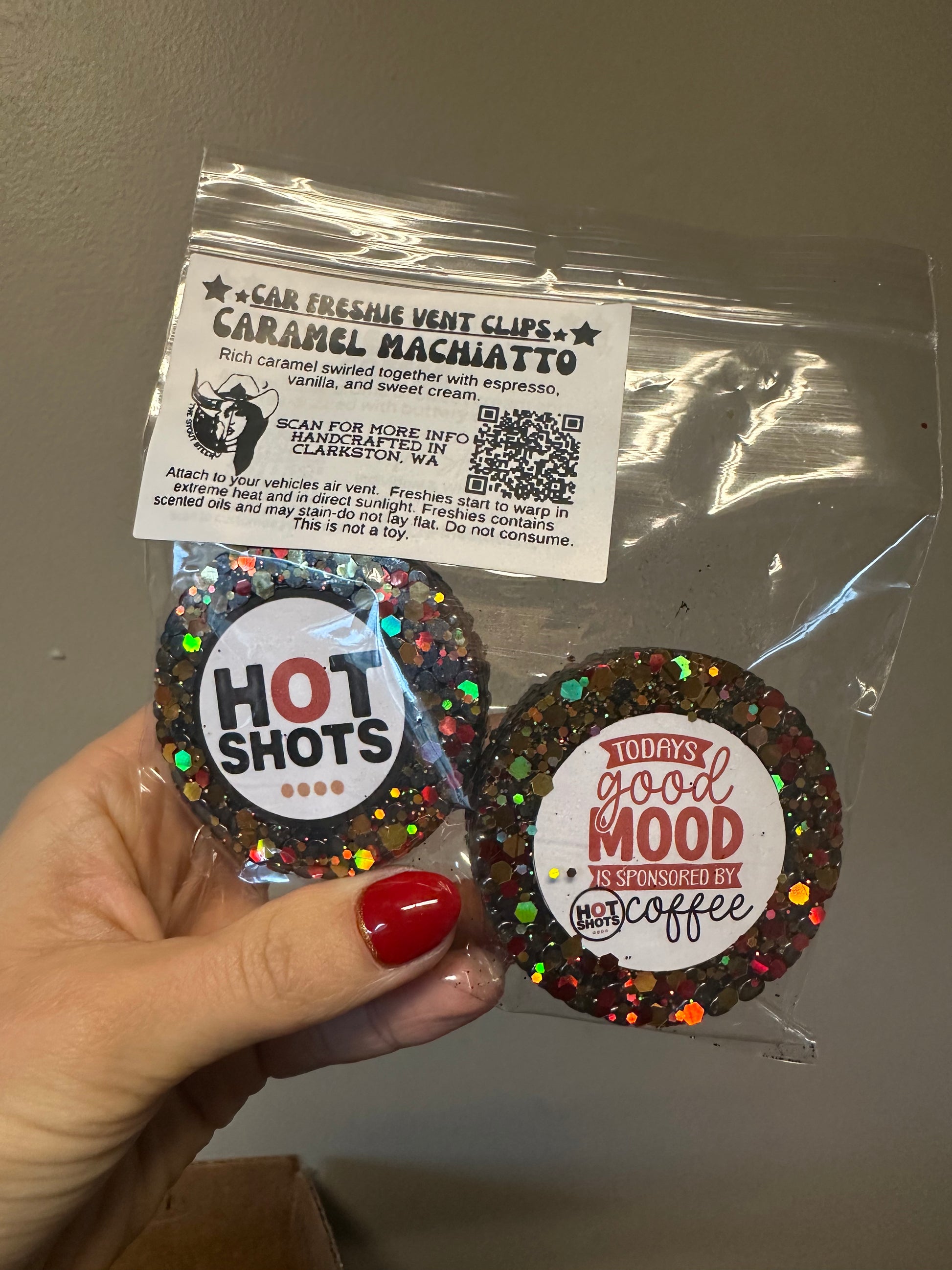 Want to offer premium, long-lasting freshies for your customers, while promoting your business? Promote your business in a fun way that also serves a purpose to your customers. I offer rearview hanging freshies and vent clip freshies. Vent clip freshies will come with horizontal vent clips or hanging vent clip option. I will best match the colors to your logo and usually use glitter, unless otherwise specified. MINIMUM QUANTITY OF 10 TOTAL IN ORDER TO QUALIFY FOR WHOLESALE PRICING.