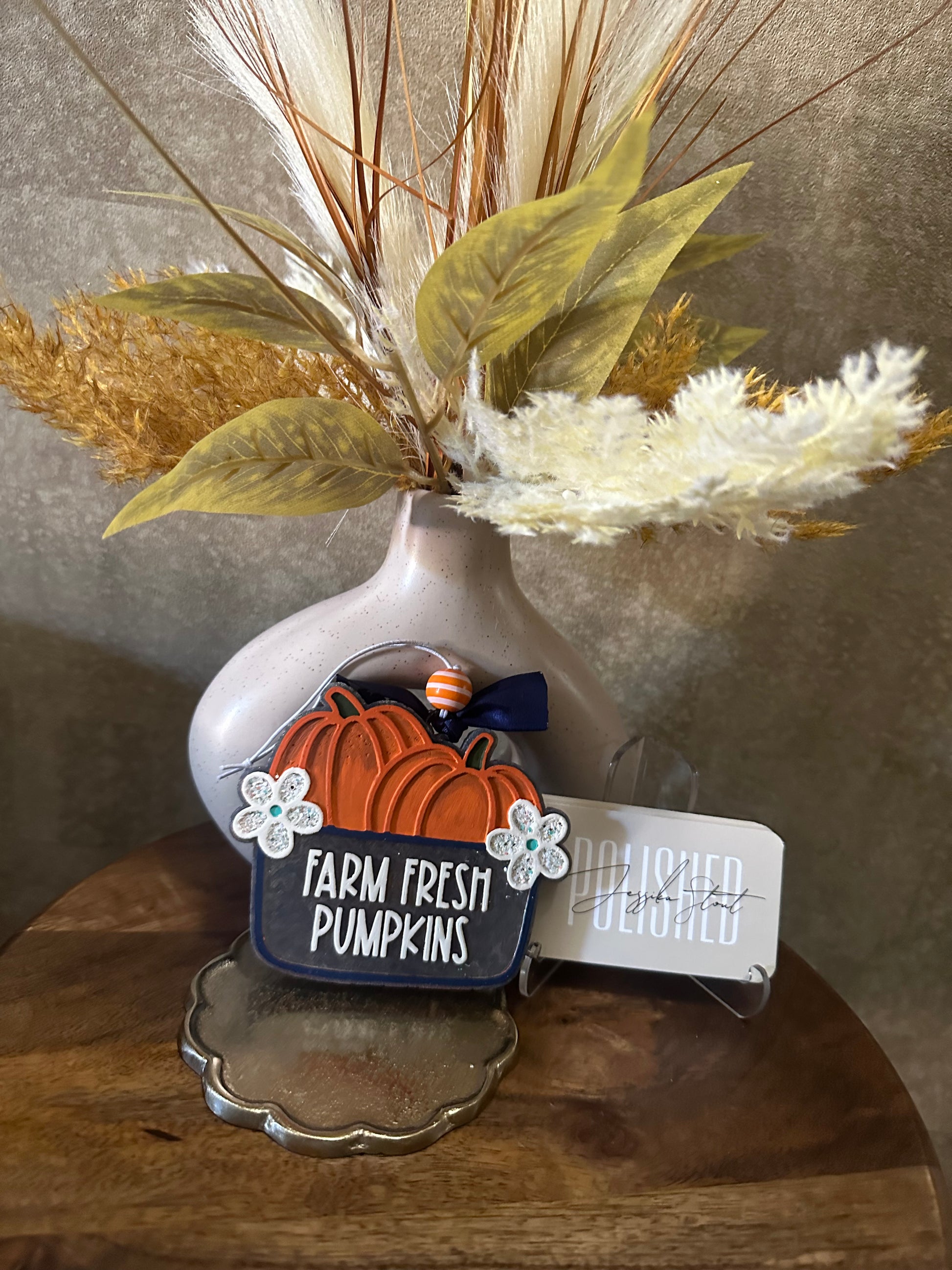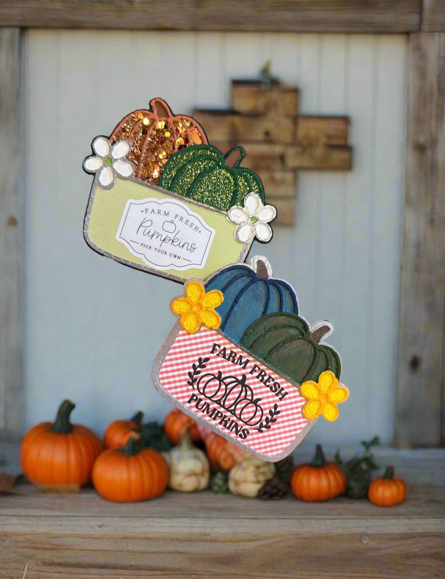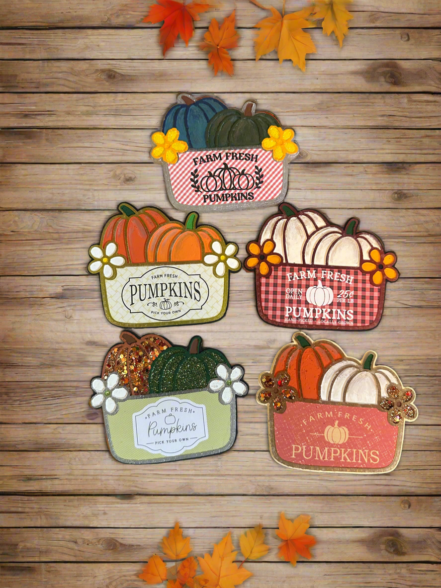 Dimensions: Approximately 4.5 x 4.5”. Cardstock option or the base basket reads “farm fresh pumpkins”.